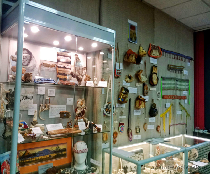 Выставку дополнила традиционная одежда и обувь северных народов. Среди экспонатов – настоящие раритеты: корякский женский кроильный нож, коллекция уникальных женских сумочек для рукоделия из лапок диких гусей, лебедя, уток, рыбьей кожи, мужские корякские и эвенские кисеты и табакерки, родовое копье и многое другое.