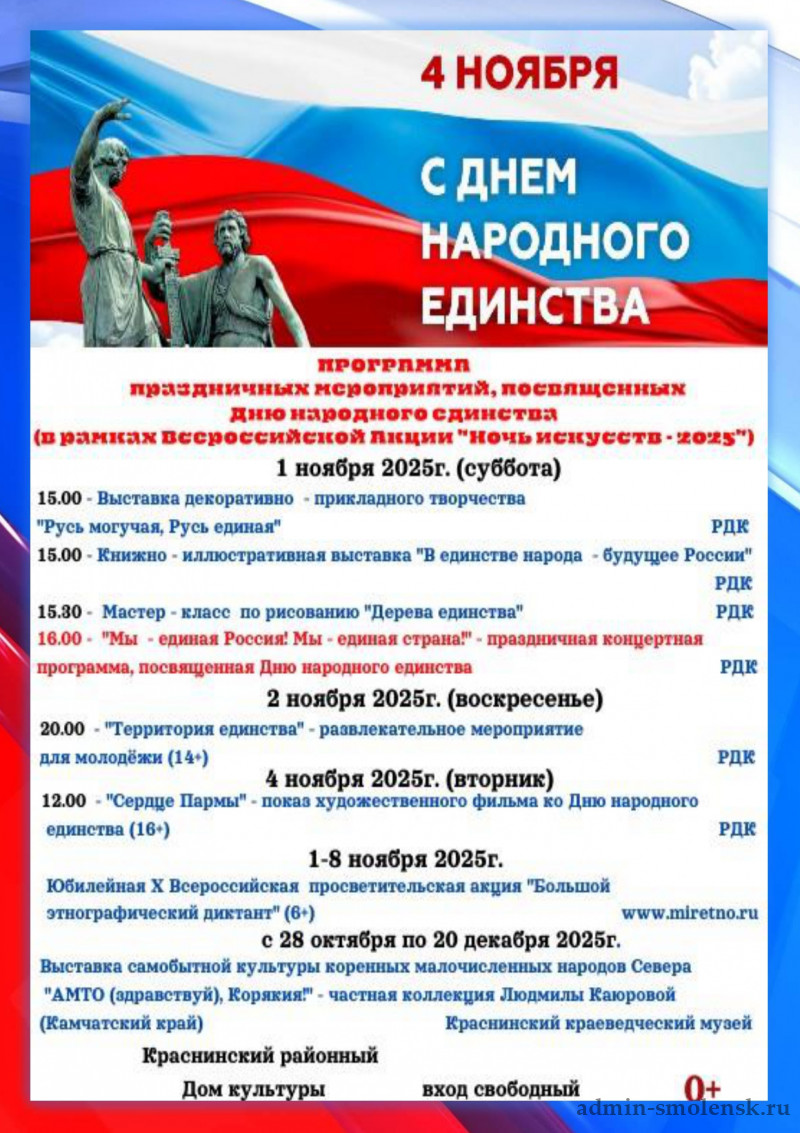 Приглашаем посетить праздничные мероприятия, посвященные Дню народного единства (в рамках Всероссийской акции «Ночь искусств-2025», которая проходит под девизом «В единстве культур - сила народа»).