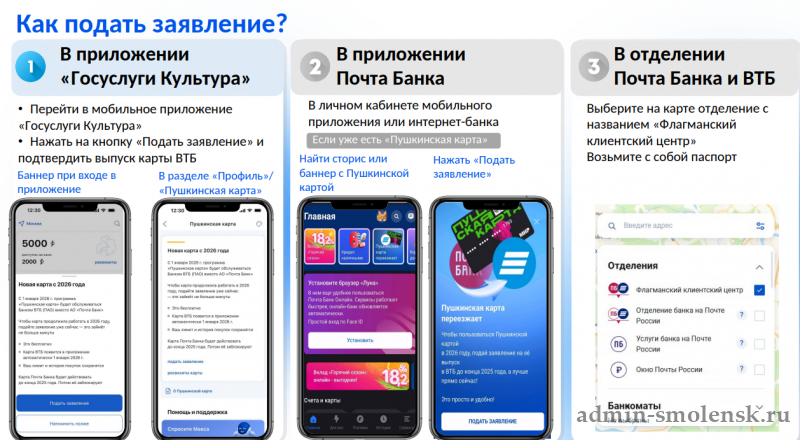 Владельцам «Пушкинской карты» нужно до 28 декабря 2025 года подать заявление на перевыпуск карт, чтобы они продолжили работать в 2026 году. Сделать это можно в: