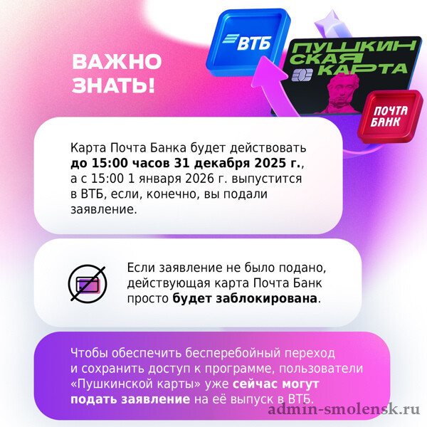 С 1 января 2026 года банк ВТБ станет оператором программы «Пушкинская карта». Решение связано с предстоящим прекращением деятельности АО «Почта Банк» ввиду присоединения к Банку ВТБ (ПАО).