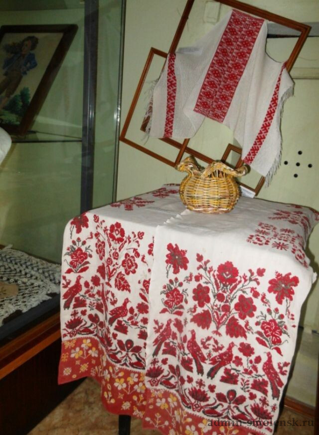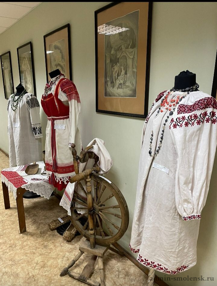 Работники Нейковского сельского Дома культуры Краснинской централизованной клубной системы Ирина Белова и Валентина Малащенкова - талантливые, творческие, неравнодушные люди, представили на выставку свои прекрасные экспонаты - это вышитые домотканые рубахи, рушники, набожники и щеть для чесания льна.