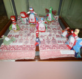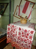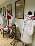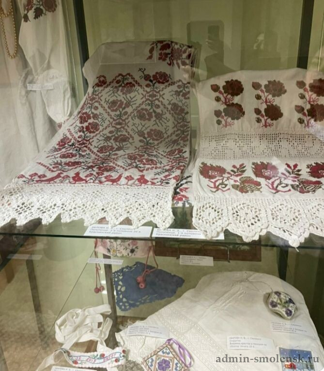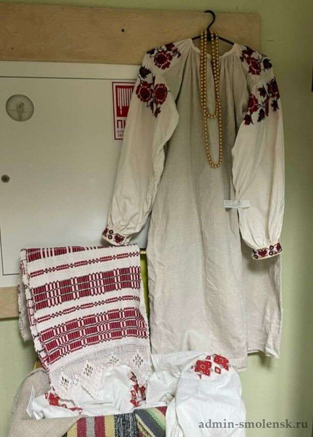 Здесь можно увидеть старинные рубахи, полотенца, салфетки, сарафаны, бабушкино кружево, домоткань, посуду и прочие предметы быта.
