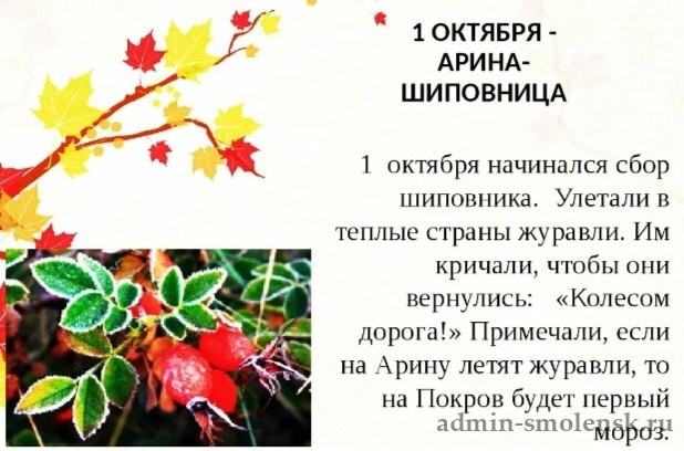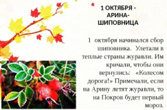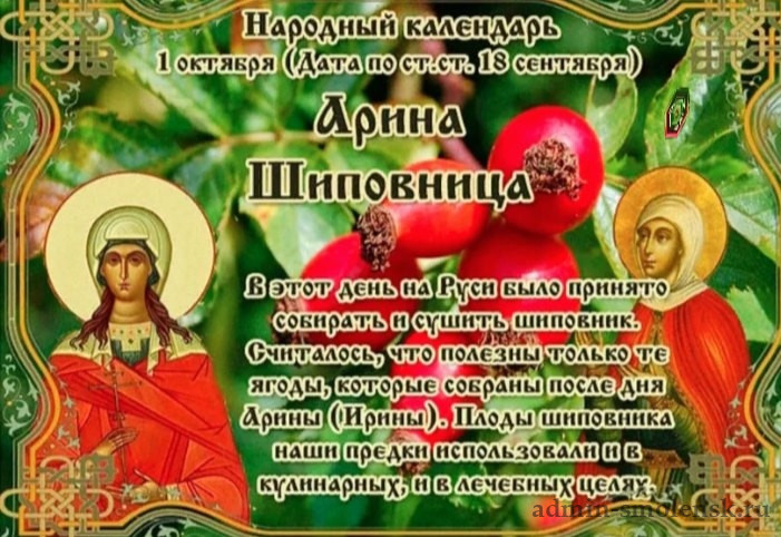 Называли Арину осеннюю «Шиповницей», так как в это время начинали собирать плоды шиповника, которые использовали в кулинарных и лечебных целях, готовили целебные отвары, чаи, варили варенье, кисель. В эти осенние вечера устраивались девичьи посиделки, во время которых не только общались, но и делали заготовки на зиму, вспоминали добрым словом «Арину Шиповницу» и просили у нее о благополучии и семейном согласии.